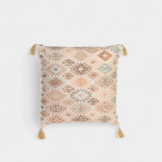 Coussin décoratif à motifs ethniques avec pompons