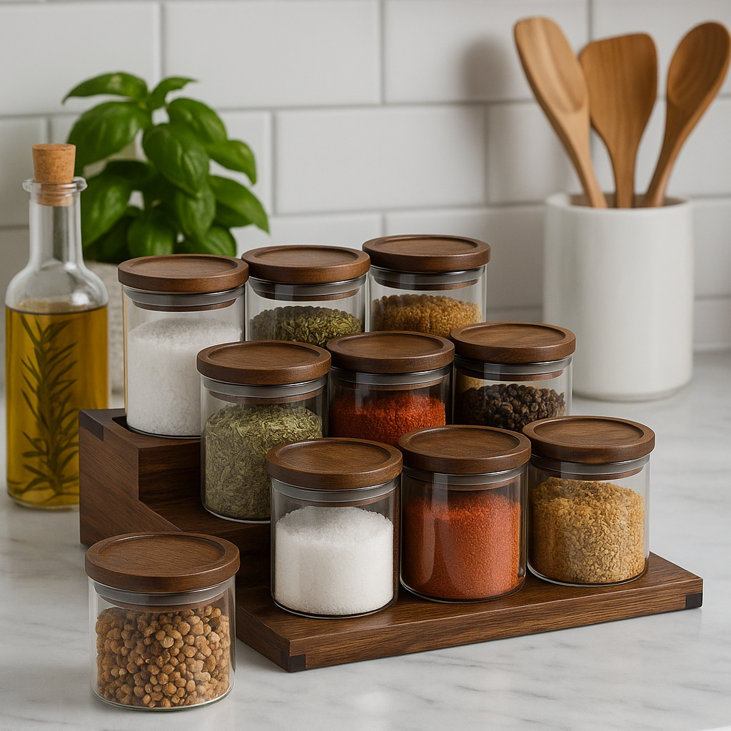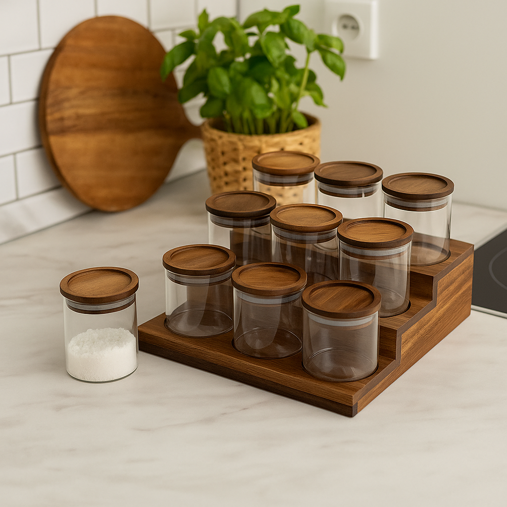 Un rangement épuré et fonctionnel pour sublimer les cuisines du quotidien. L’arbre à épices GUSTAVE allie élégance et praticité avec ses neuf pots en verre transparent, surmontés d’un couvercle en bois foncé au design naturel. Parfait pour organiser vos épices tout en gardant un plan de travail soigné.