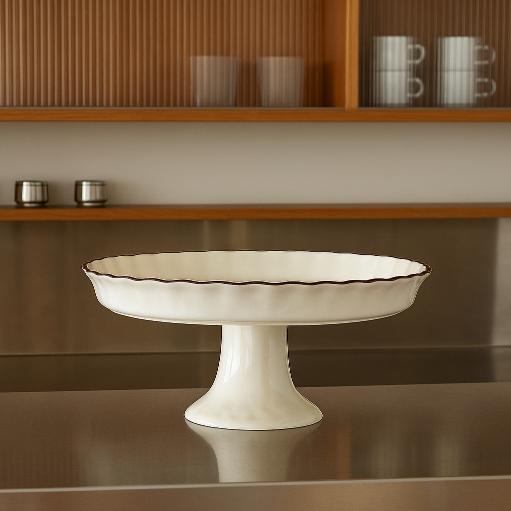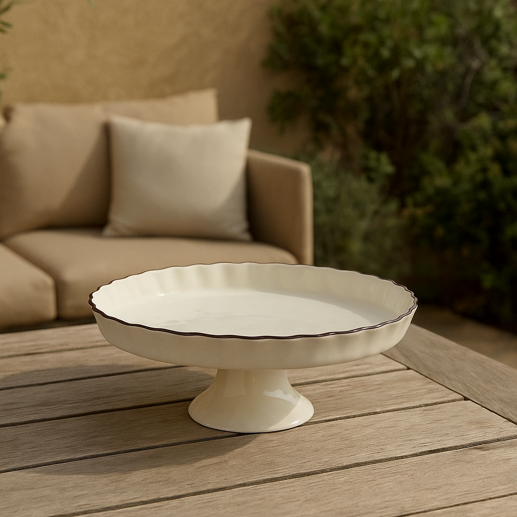 Assiette sur pied ondulé blanc liseré marron