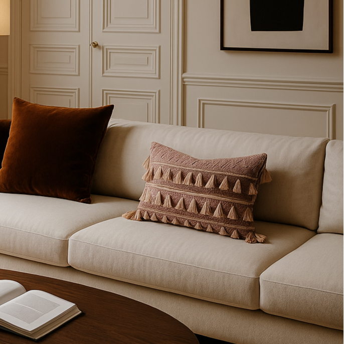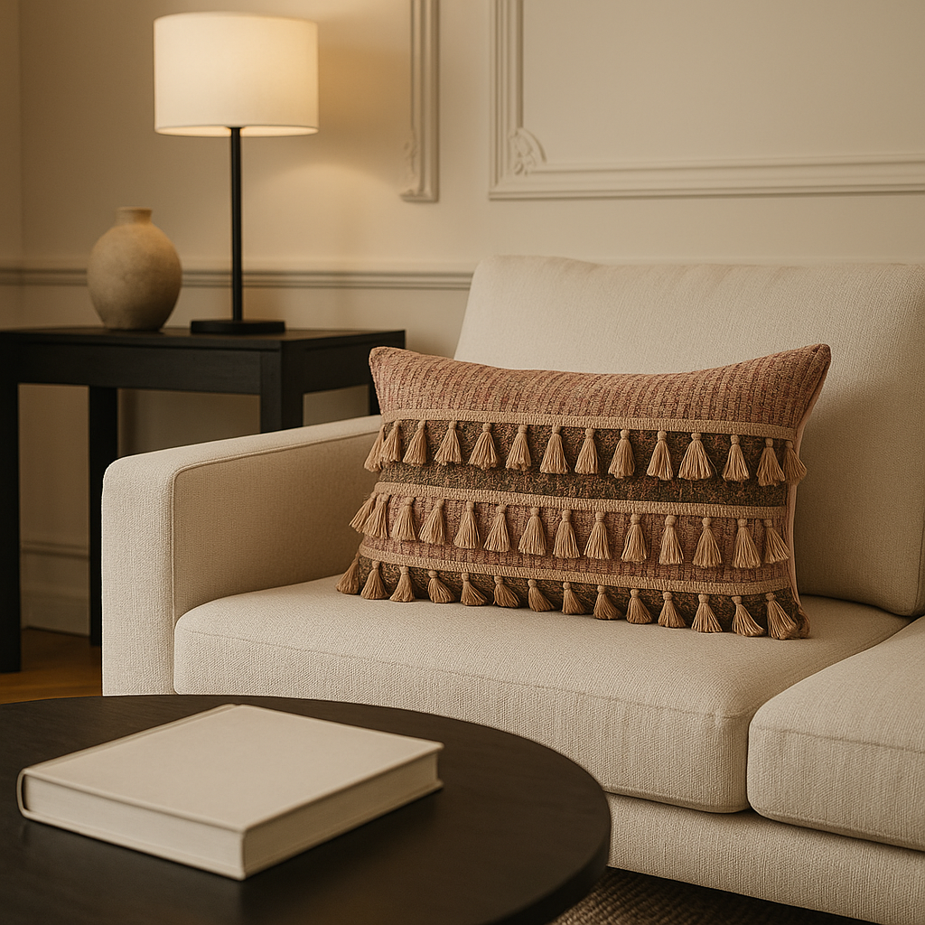 Ce coussin rectangulaire apporte une note chaleureuse et texturée à votre intérieur. Son tissage riche en nuances de beige, rose poudré et brun est sublimé par de délicats pompons disposés en bandes horizontales. Le dos en velours doux couleur rose poudré complète son allure raffinée tout en offrant un toucher agréable. Idéal sur un canapé, un fauteuil ou un lit, il crée une ambiance cosy et élégante.