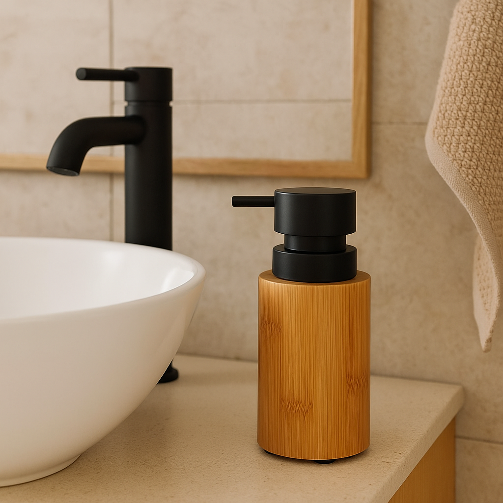 Apportez une touche naturelle et design à votre salle de bain avec le distributeur de savon Kanoa. Sa base en bambou lisse s’associe à une pompe noire mate pour un contraste élégant et contemporain. Pratique et esthétique, il s’intègre parfaitement dans une décoration épurée.