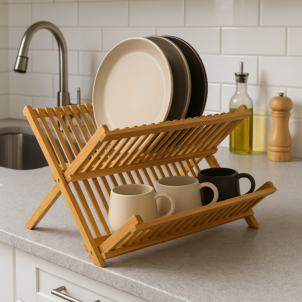 Alliez naturel et praticité avec cet égouttoir pliable en bambou, un essentiel des cuisines de toute taille.