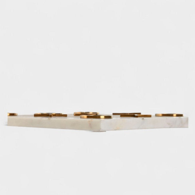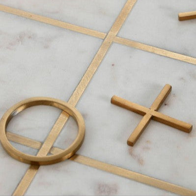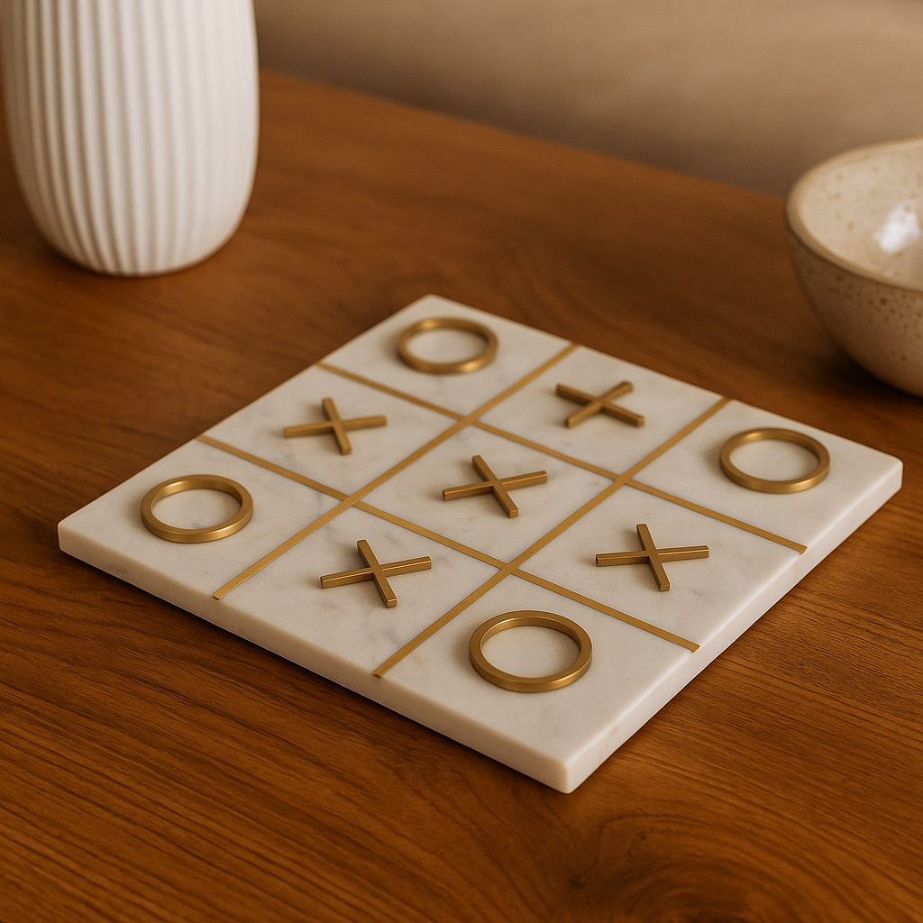 Élégant et raffiné, ce jeu de société revisite le classique morpion avec une touche design. Conçu en pierre blanche et détails en laiton doré, il devient autant un objet décoratif qu’un moment de partage. Placé sur une table basse ou une console, il attire le regard et invite à la convivialité. Un accessoire intemporel qui allie esthétisme et divertissement.