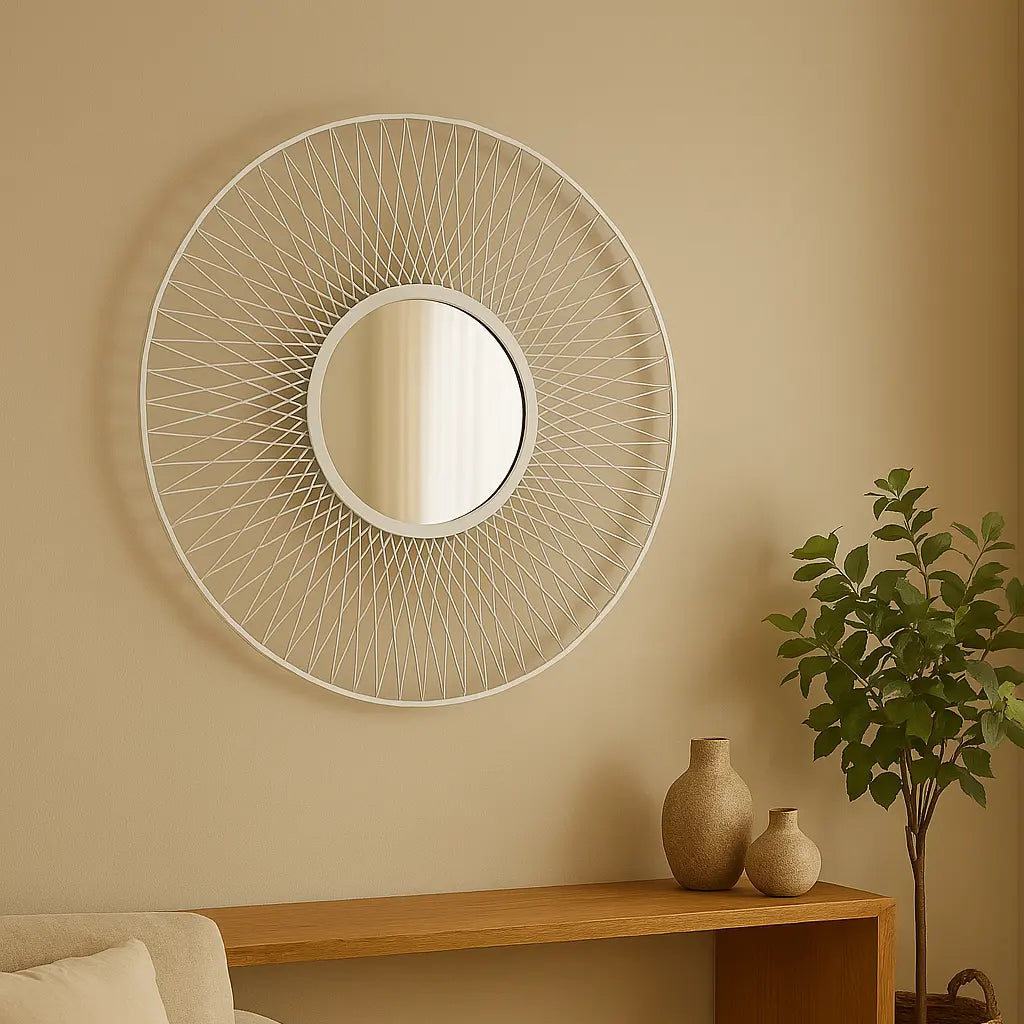 Avec sa structure fine en métal blanc, ce miroir rond joue sur la légèreté et les lignes. Son design rayonnant apporte une touche contemporaine et graphique, tout en douceur. Idéal pour illuminer un mur et agrandir visuellement l’espace.