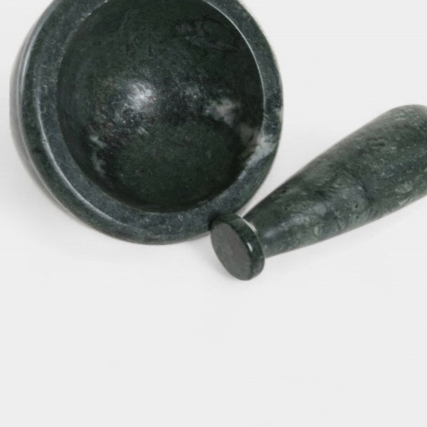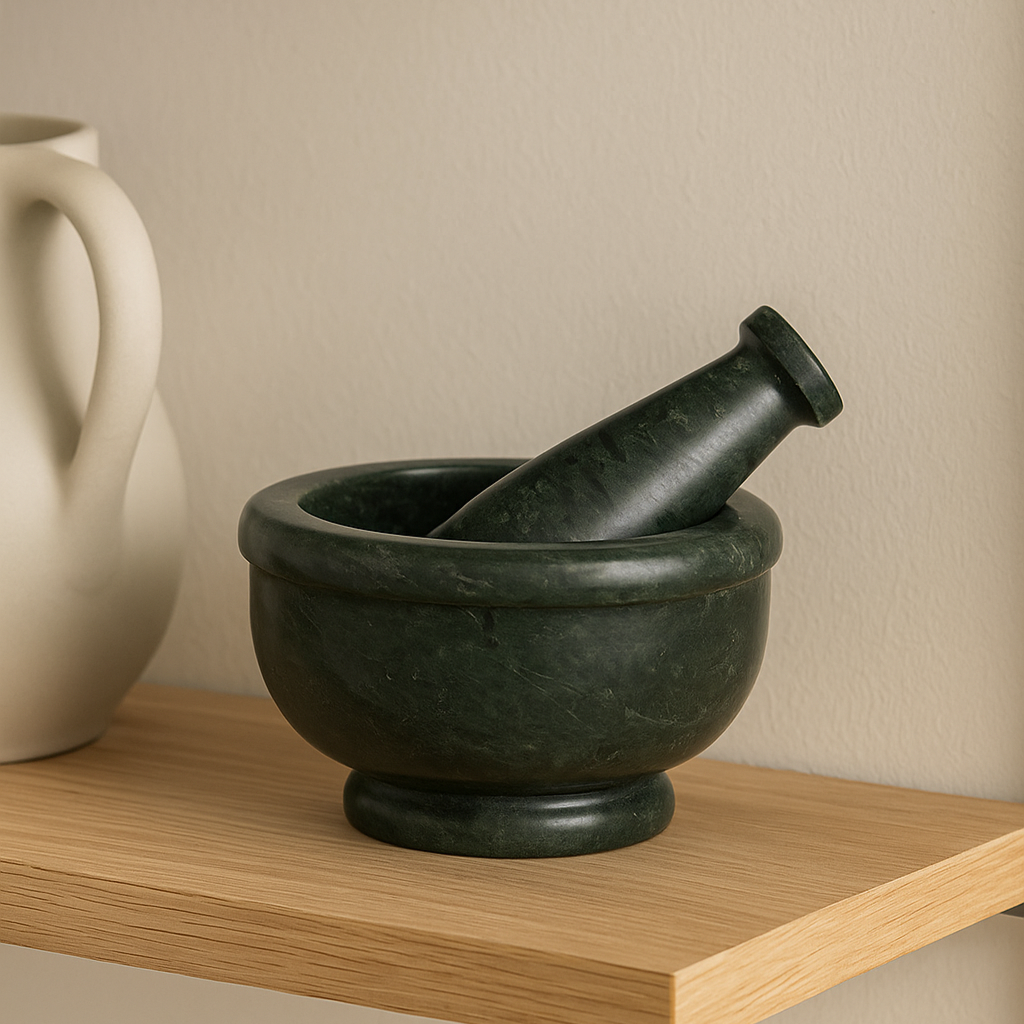 Écrasez, broyez, sublimez vos préparations avec élégance. Ce mortier en marbre vert, accompagné de son pilon assorti, allie robustesse et raffinement. Sa couleur lui confère une allure sculpturale qui en fait autant un outil pratique qu’un bel objet décoratif pour la cuisine.