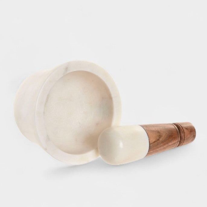 Mortier de cuisine en marbre blanc et bois d'acacia