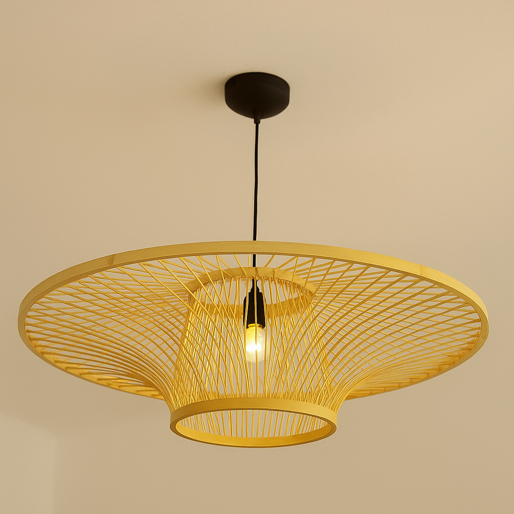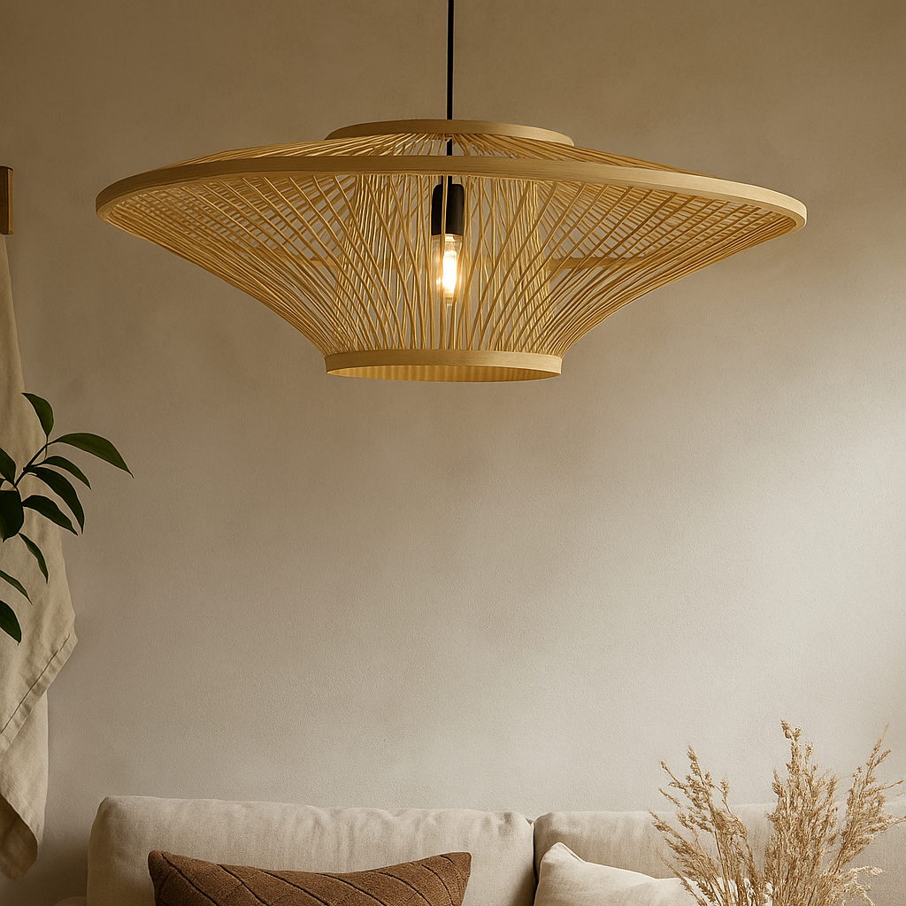 Idéale au-dessus d’une table de salle à manger, dans une chambre ou sur une terrasse couverte, elle structure l’espace avec simplicité.
