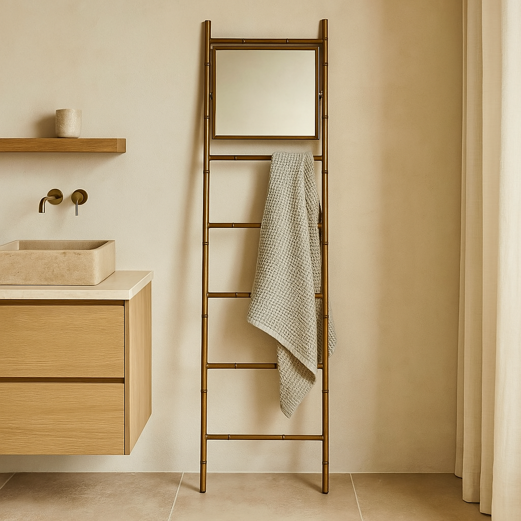 Sa structure légère et graphique s’appuie simplement contre un mur pour accueillir serviettes ou textiles, tout en apportant une touche design subtile. Son effet bambou lui donne un aspect artisanal très raffiné.