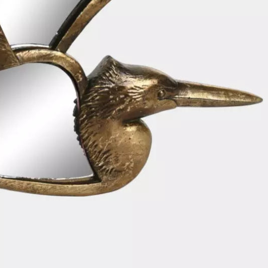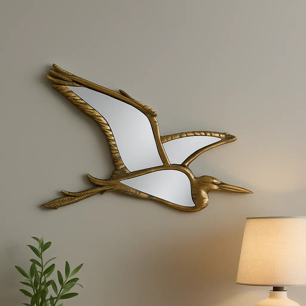 Ajoutez une touche poétique et lumineuse à votre décoration avec ce miroir mural en forme d’oiseau en plein vol. Son design doré élégant et ses surfaces miroitées apportent une sensation de légèreté tout en capturant la lumière de façon subtile. À la fois figurine décorative et miroir, cette pièce singulière attire le regard sans en faire trop.