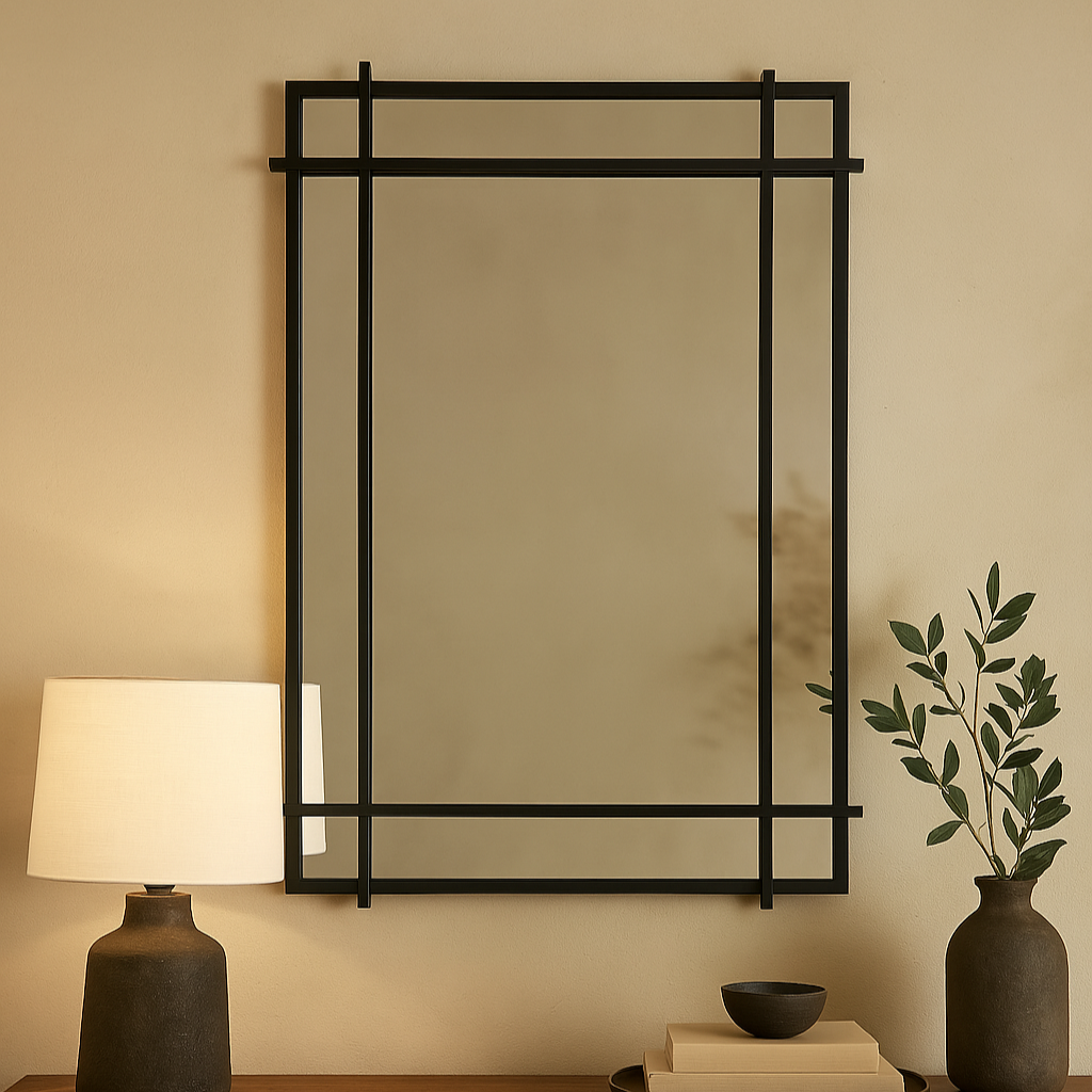 Un miroir au style moderne et structuré, qui joue avec les lignes pour un rendu graphique fort. Sa finition noire mate et son cadre en fer apportent caractère et profondeur à n’importe quel mur. À la fois fonctionnel et décoratif, il se marie parfaitement aux intérieurs minimalistes ou plus audacieux.