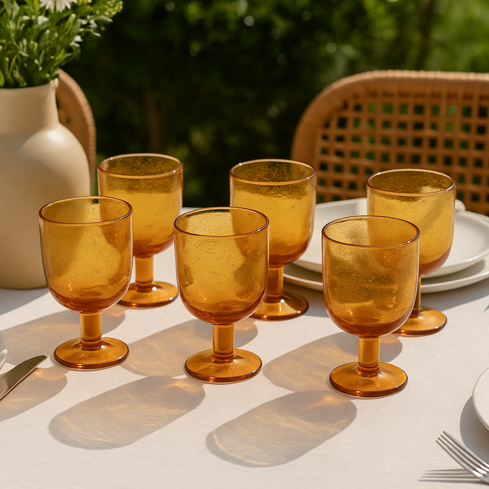 Une couleur ambre profonde et délicatement bullé pour sublimer vos tables. Ces verres à pied en verre soufflé allient charme artisanal et raffinement, parfaits pour toutes vos réceptions ou vos instants du quotidien. Leur design intemporel apporte une touche de caractère à chaque dégustation.