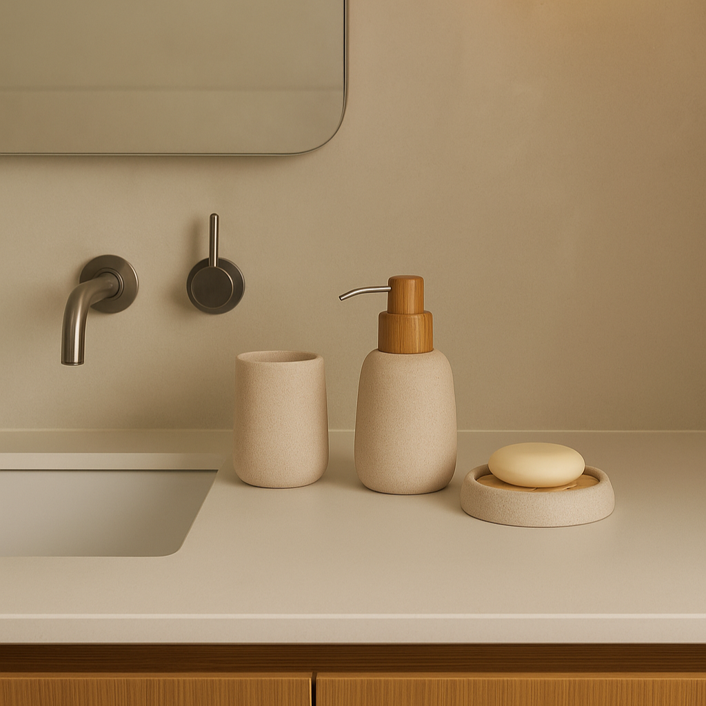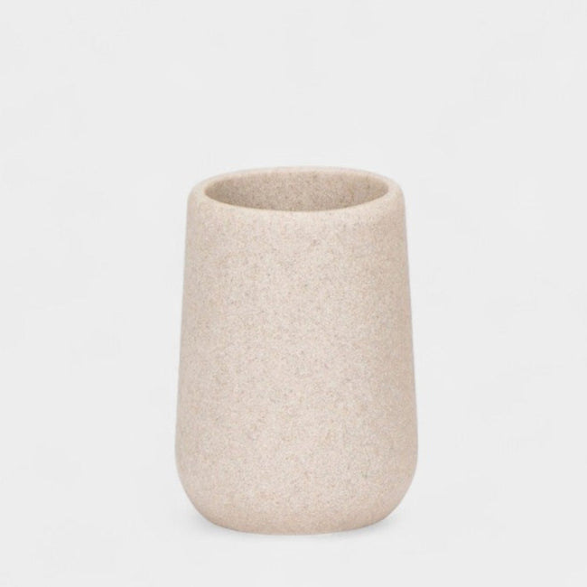 Un indispensable au design doux et minéral. Ce gobelet en grès effet sable apporte une touche naturelle à votre salle de bain, tout en restant pratique au quotidien. Sa forme arrondie et sa texture légèrement granuleuse évoquent la simplicité et le calme. Parfait pour accueillir brosses à dents, pinceaux ou petits accessoires.