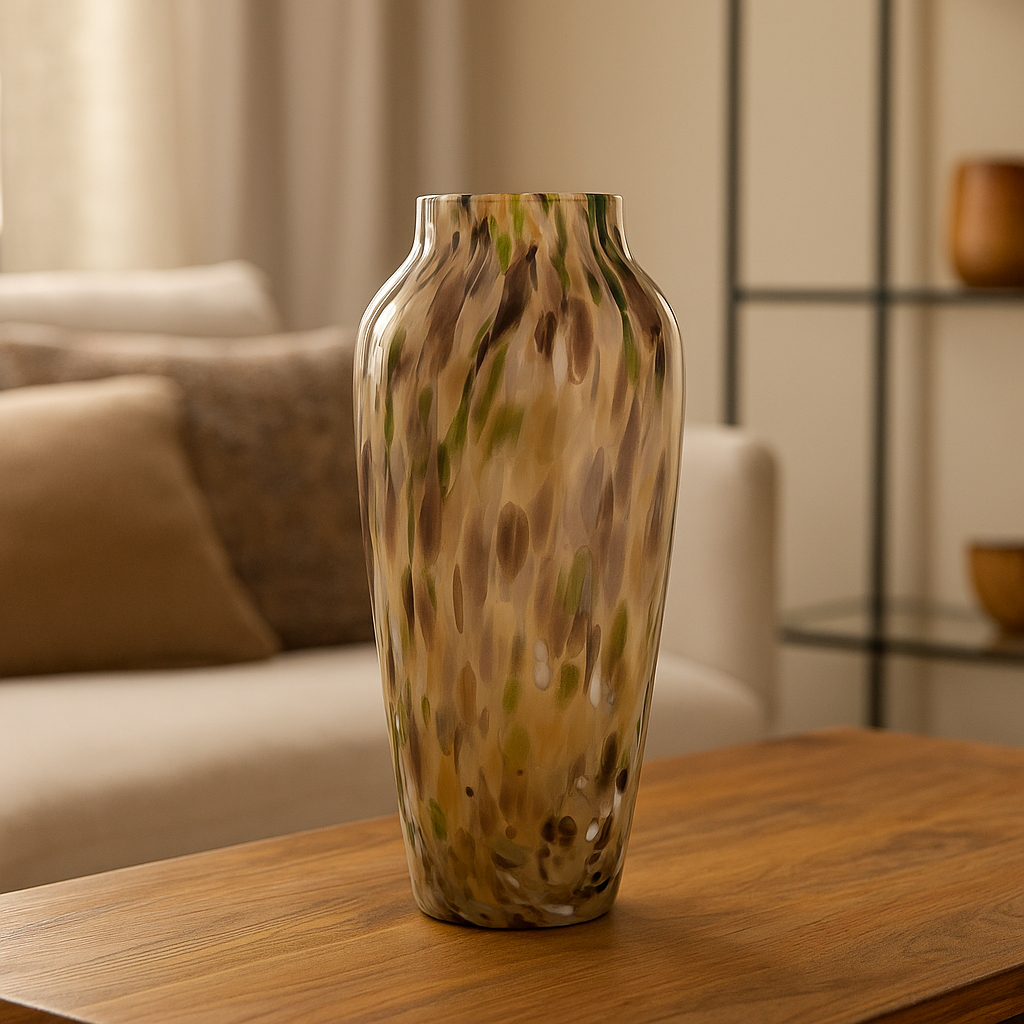 Un vase sculptural qui attire le regard dès le premier coup d’œil. Avec son verre soufflé moucheté aux teintes naturelles de vert, beige et brun, il apporte une touche artistique tout en subtilité. Son format élancé structure l’espace avec élégance, qu’il soit utilisé seul ou accompagné de branches séchées.
